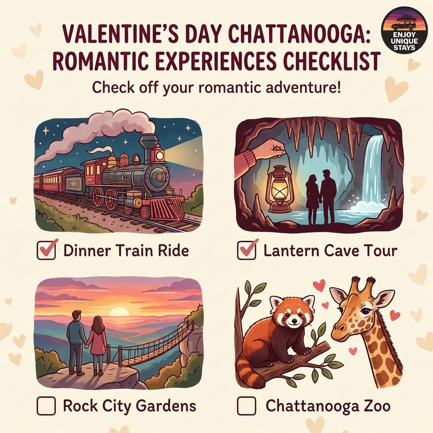 Chattanooga has many great spots. For a classic romantic vibe, try the Valentine’s Dinner Train at the Tennessee Valley Railroad Museum. If you want something unique, book a lantern tour at Ruby Falls. For a casual and fun date, visit the Chattanooga Zoo or grab coffee at Frothy Monkey.