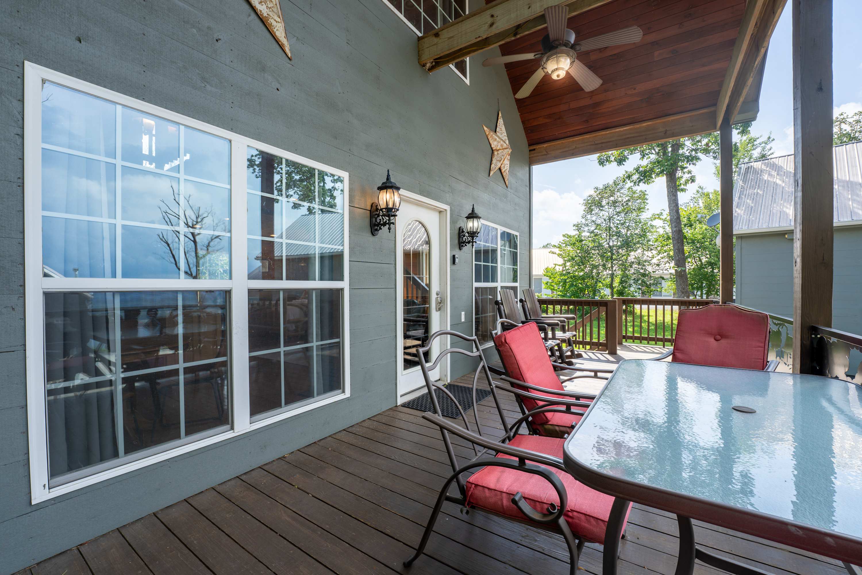 “Impressed with the cleanliness and attractiveness of the interior. Kitchen well stocked and had more than advertised in terms of utensils and a few staples. The outside and stairs and deck could use some sprucing up and the deck fan needs to be replaced very badly. It rained and the window just above the air conditioning unit on the first floor leaked around there might not be any flashing outside. The hot tub was great. Would love to see another partial fence to hide bathers from the lights of the pool.”