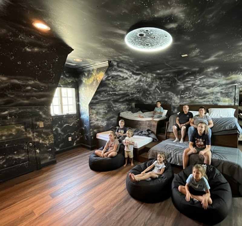 Bunk Room – 2 Queen bunks with twins overhead & 4 Twin beds in theater room