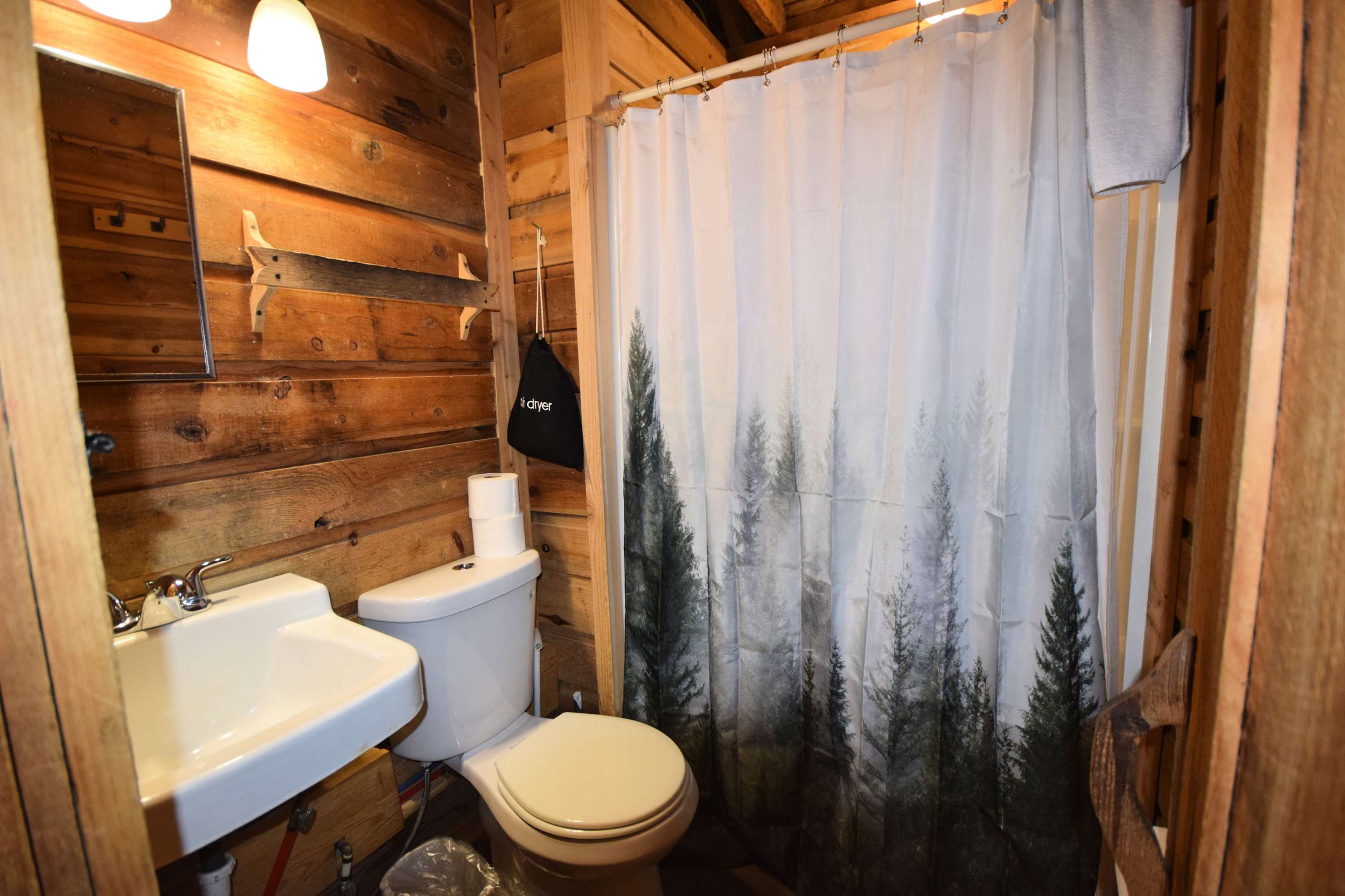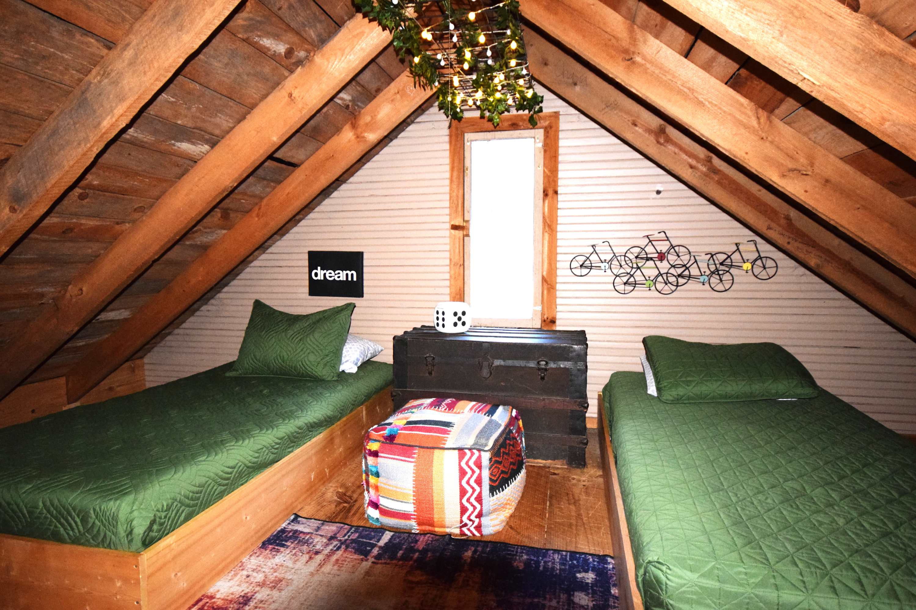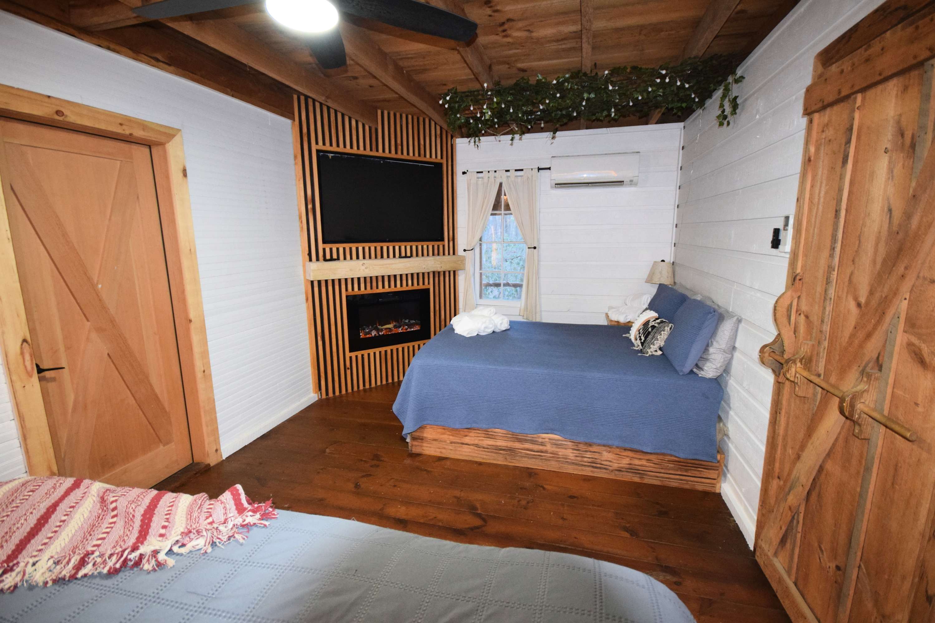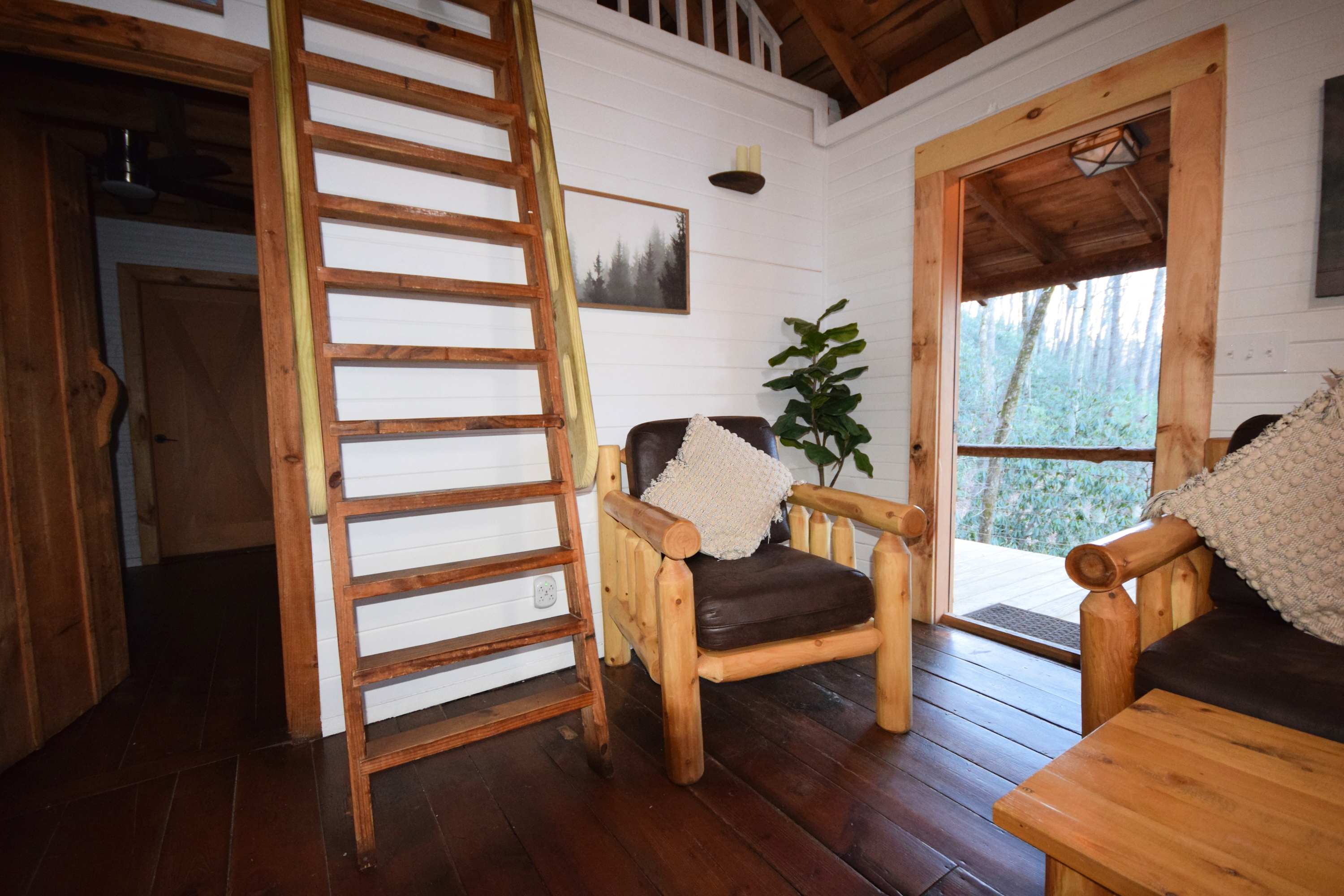 High Top sleeps 5 people comfortably with a king bed in the downstairs bedroom and 3 twins upstairs. The loft is accessible by a built-in ladder. Other features include a fully equipped kitchen including fridge, oven, coffee maker, and microwave, electric heat, air conditioning unit, a bathroom with shower, and ceiling fans in the bedroom and living area. You also have access to your own barrel sauna and hot tub!