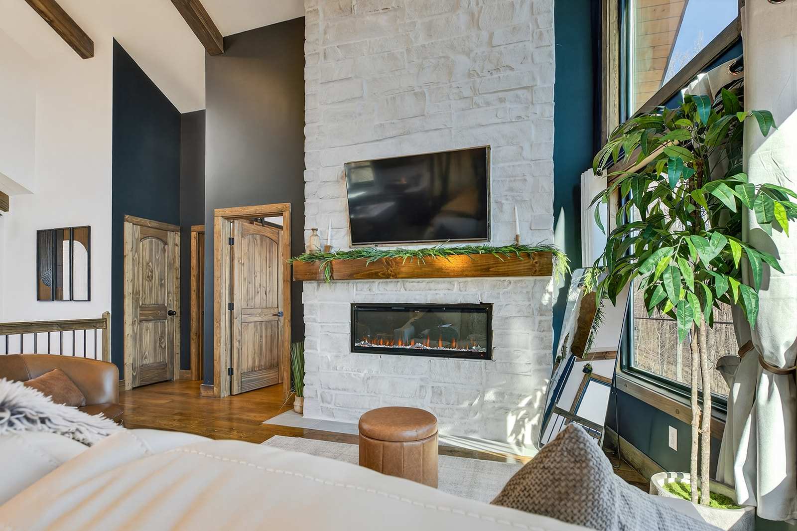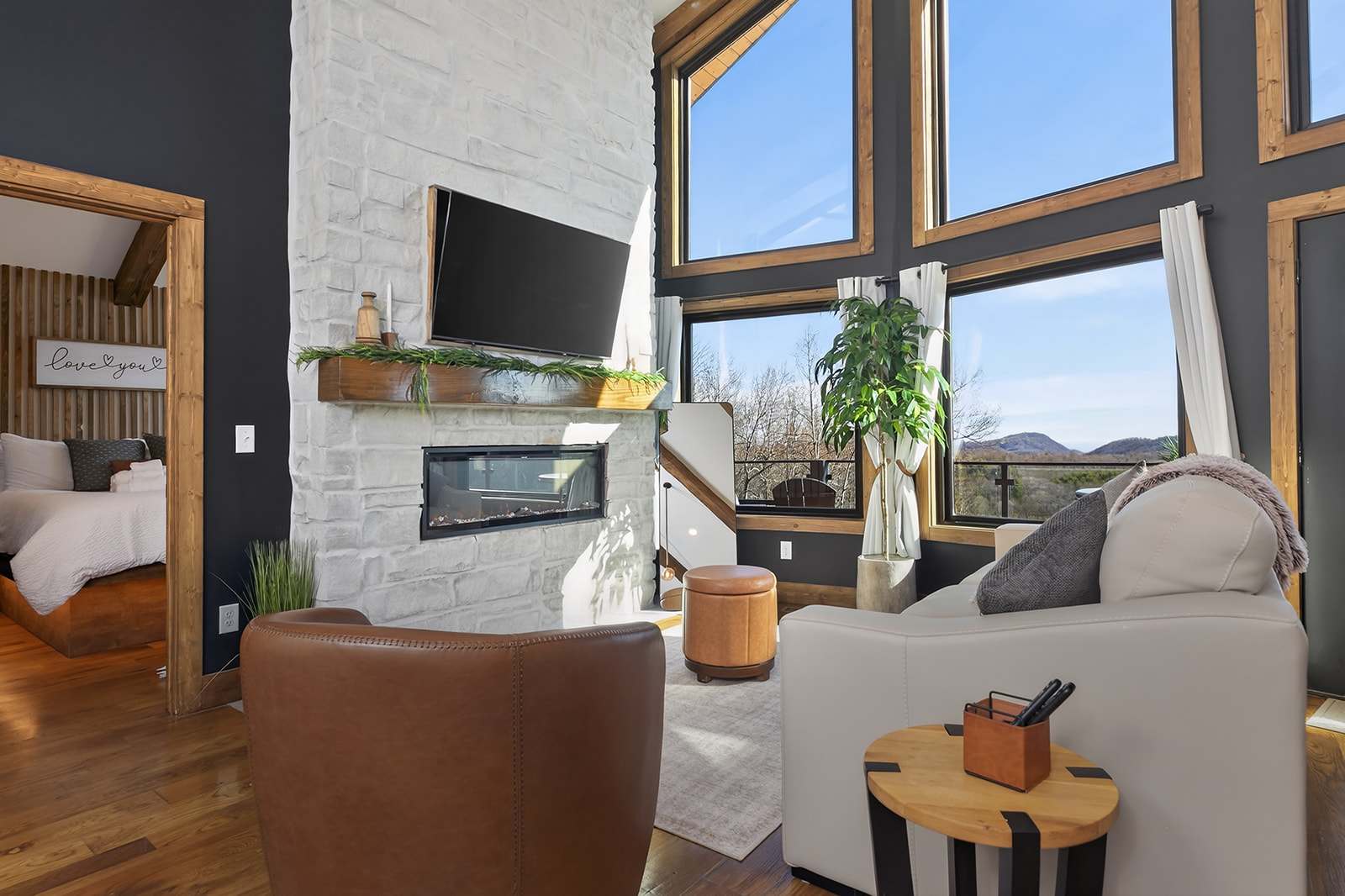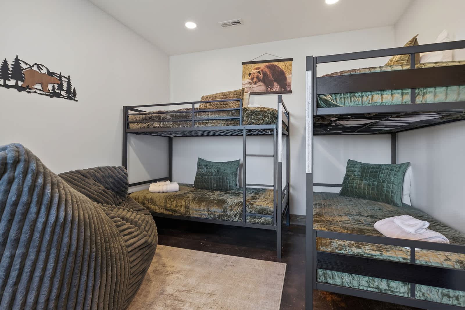 The upper level boasts a modern kitchen, comfortable living room, and deck access with scenic views—ideal for morning coffee or evening unwinding. The upstairs king bedroom includes a TV, electric fireplace, closet, and bathroom access, plus entry to the back deck. Downstairs, another king bedroom with TV offers convenience, alongside a second bathroom and a bunk room with two twin-over-twin beds, making it a fun option for kids or friends.