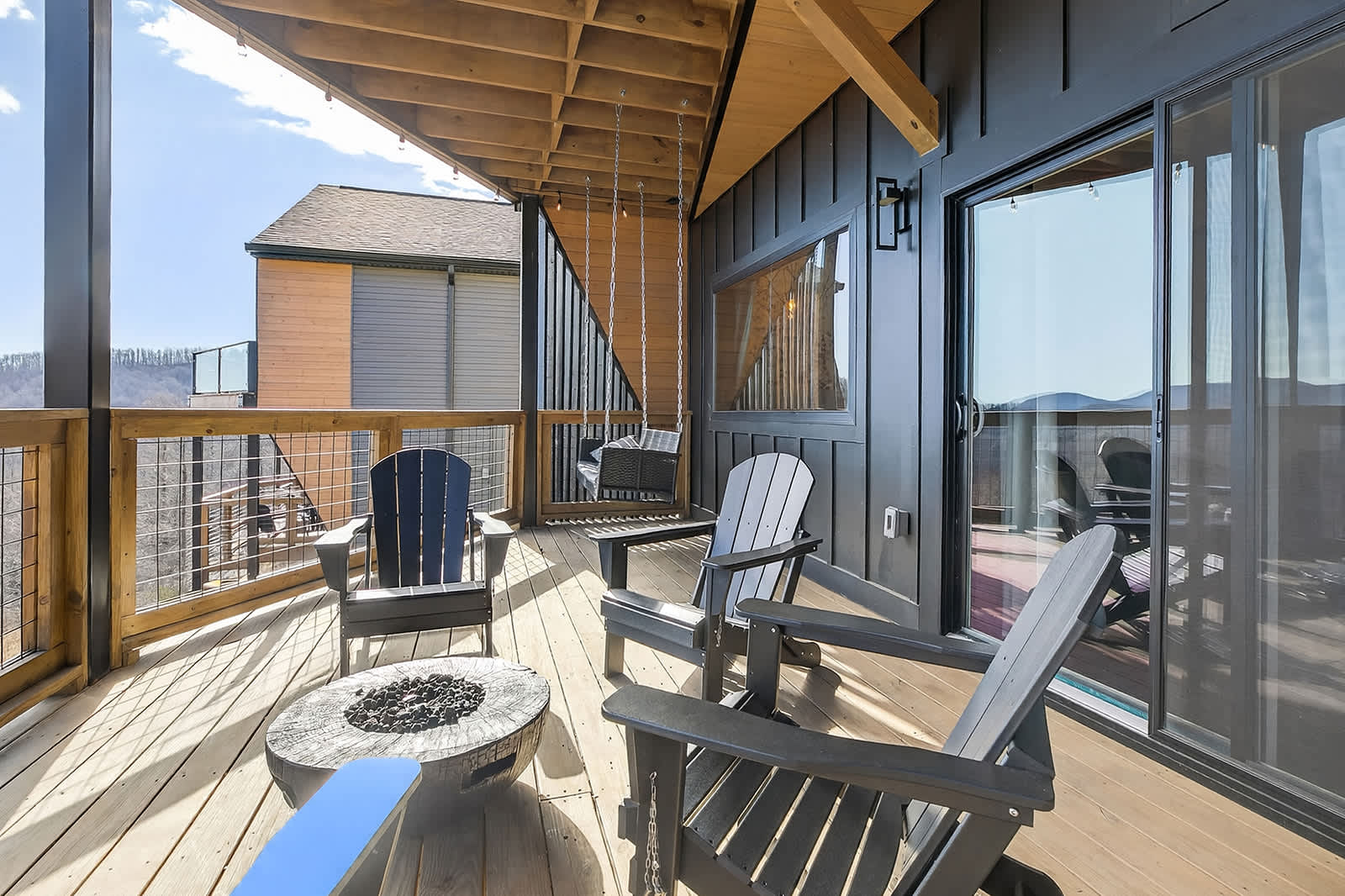 Outdoor decks on both levels create the perfect setting to take in the mountain views, gas fire pits and Adirondack seating welcome those quiet relaxing nights. Additional comforts include a washer/dryer, oven, microwave, and two full bathrooms—one featuring a double vanity and walk-in shower, the other a tub/shower combo.