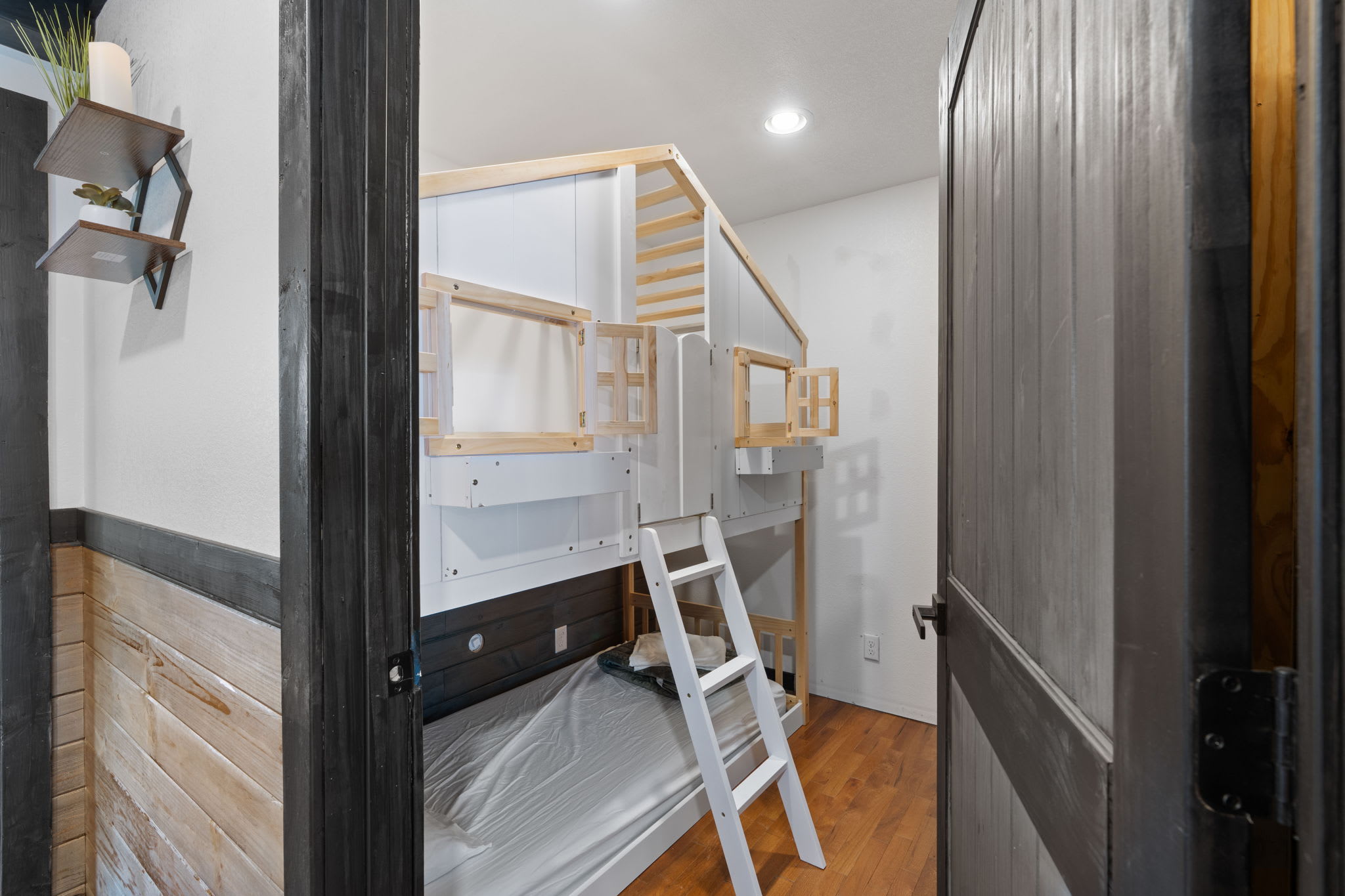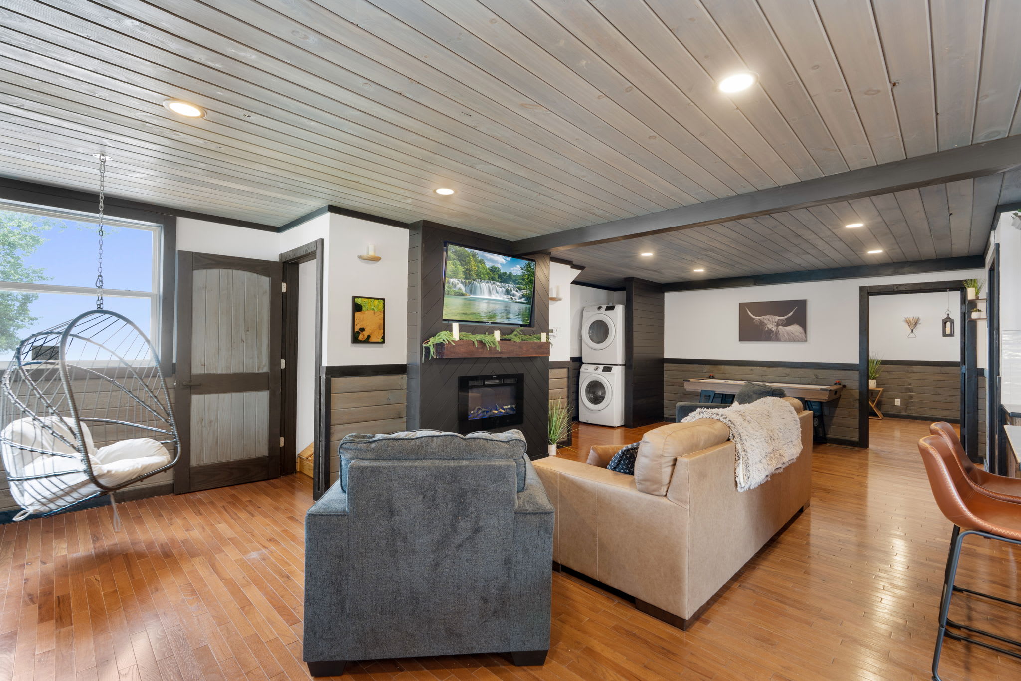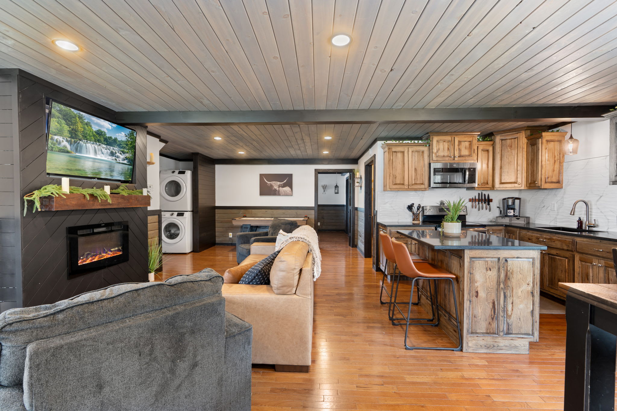 On the main level, you’ll find Bedroom 1, featuring a king bed, an electric fireplace, and a private bathroom. The second bedroom on the main level features a bunk bed with two twin beds. The kitchen, living room, washer & dryer, and one bathroom are also on this level.