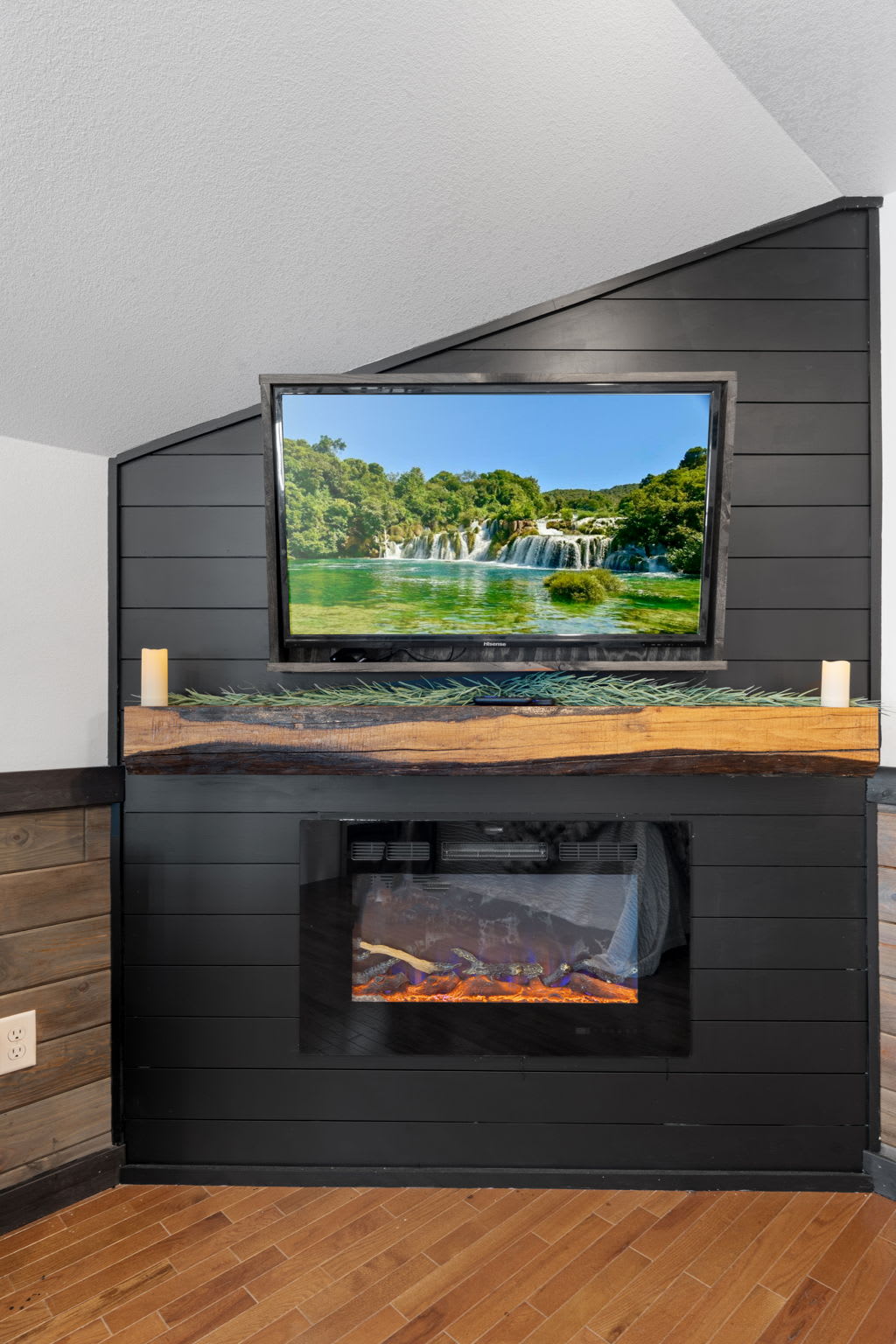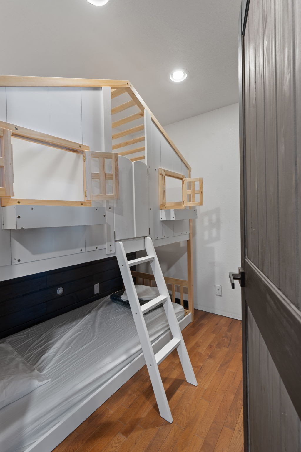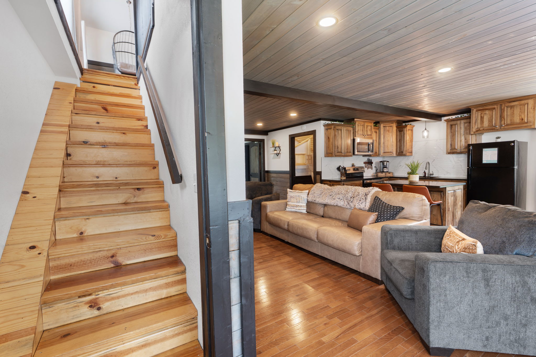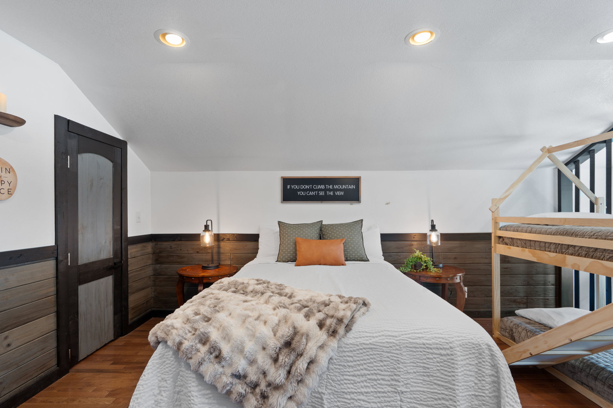 On the main level, you’ll find Bedroom 1, featuring a king bed, an electric fireplace, and a private bathroom. The second bedroom on the main level features a bunk bed with two twin beds. The kitchen, living room, washer & dryer, and one bathroom are also on this level.