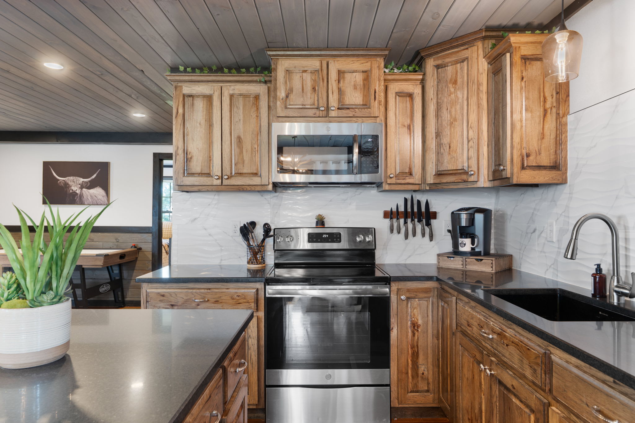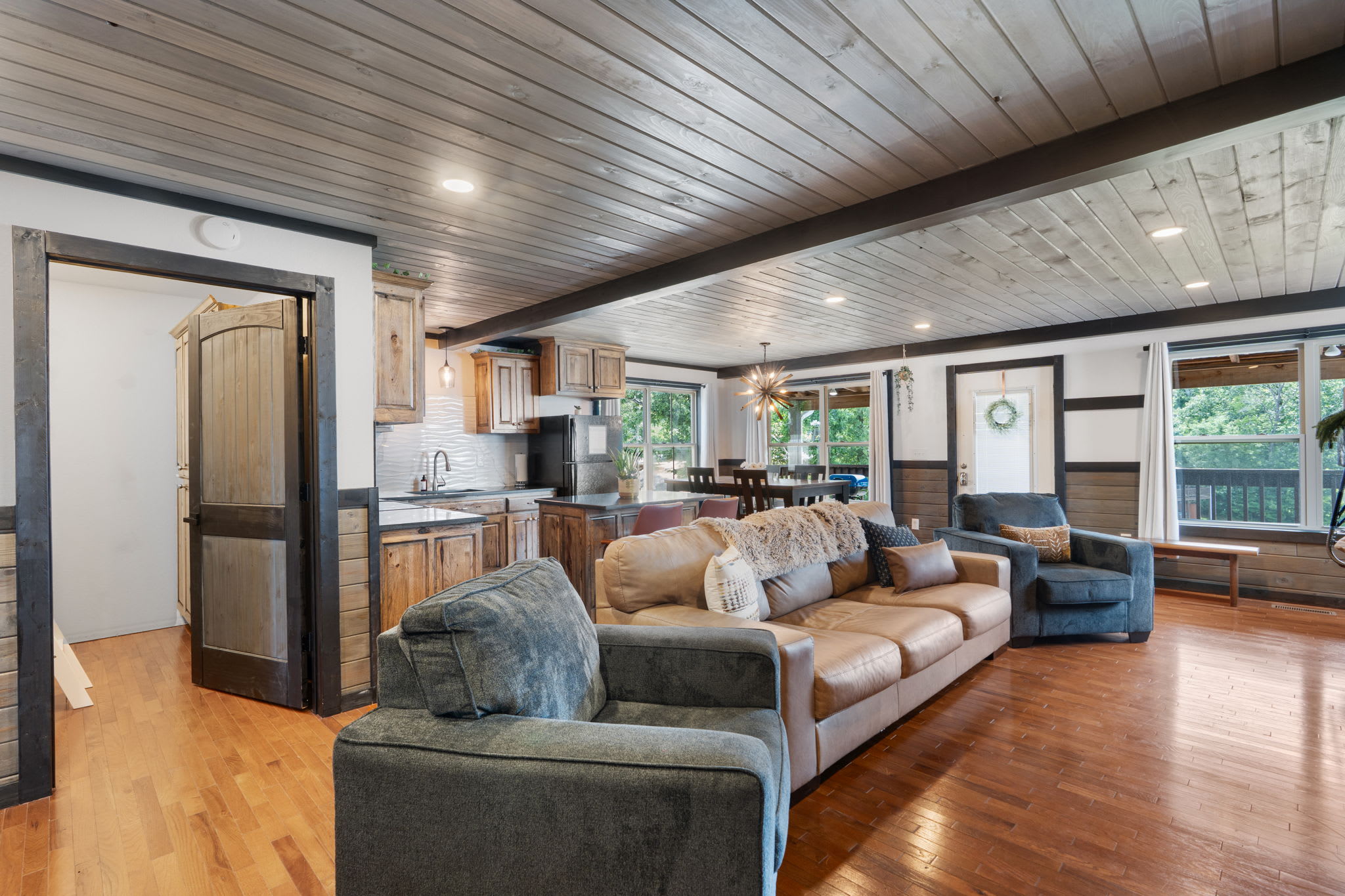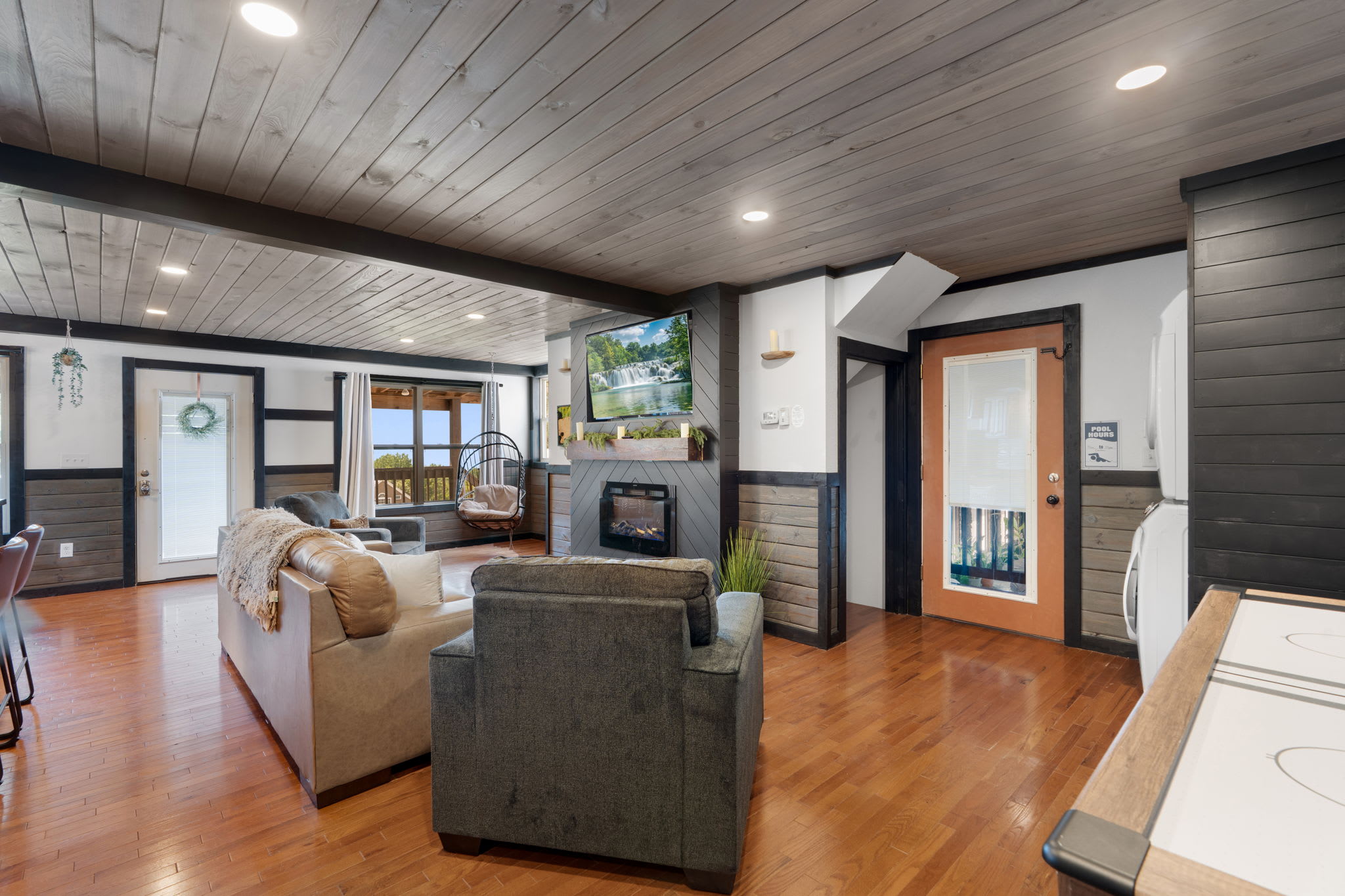 The Pool Lodge is ideal for those who enjoy a spacious, well-equipped cabin with easy access to the pool and stunning outdoor views. We provide a starter kit that includes one roll of paper towels, one roll of toilet paper per bathroom, three garbage bags per can, starter dish soap, and hand soap. Linens and towels are also supplied, and a washer and dryer are available for your convenience. The kitchen comes equipped with basic cooking utensils, but there is no dishwasher, so we suggest bringing paper products for easier cleanup. We do not provide oil, salt, pepper, food, drinks, or personal toiletries.