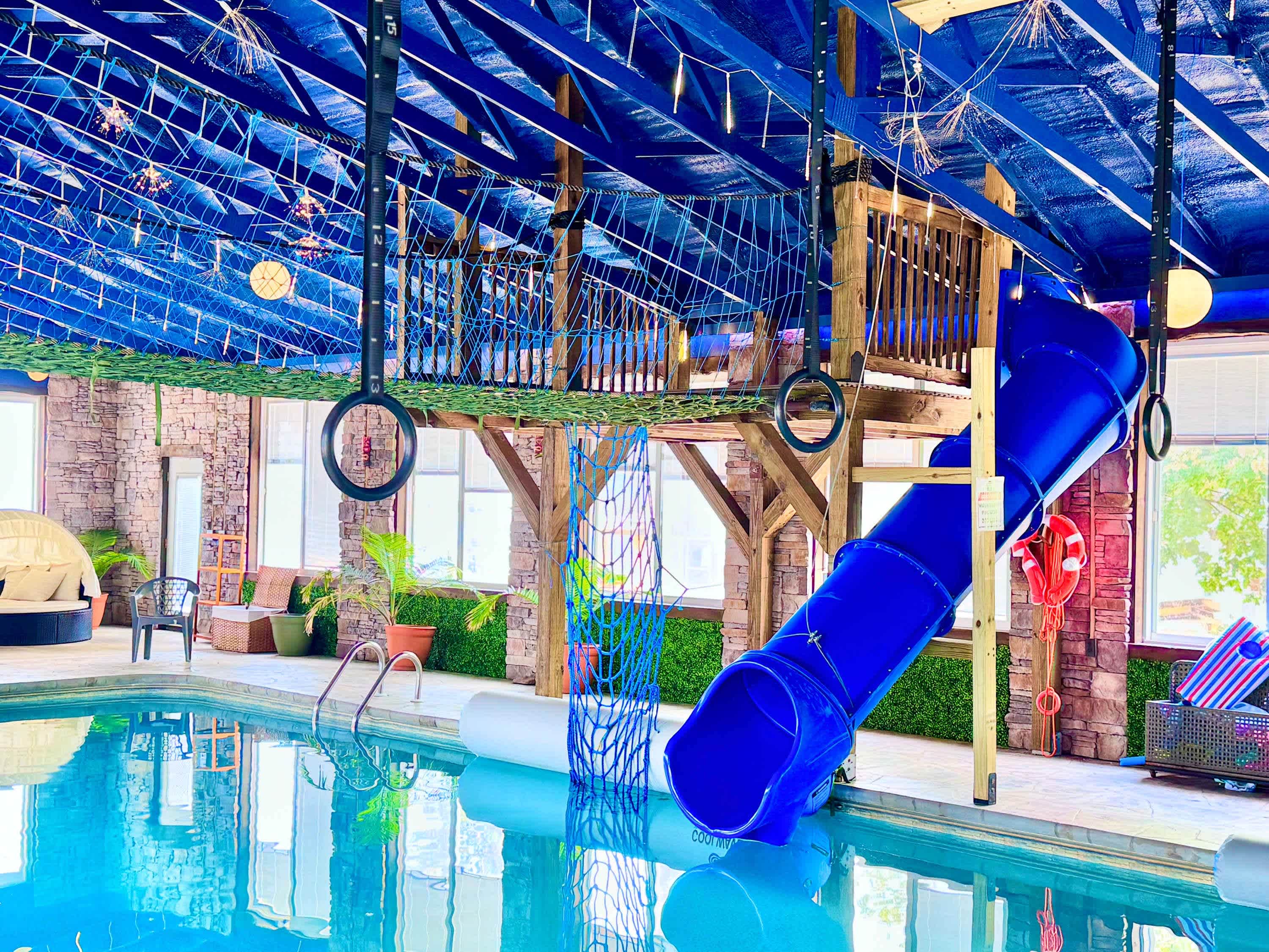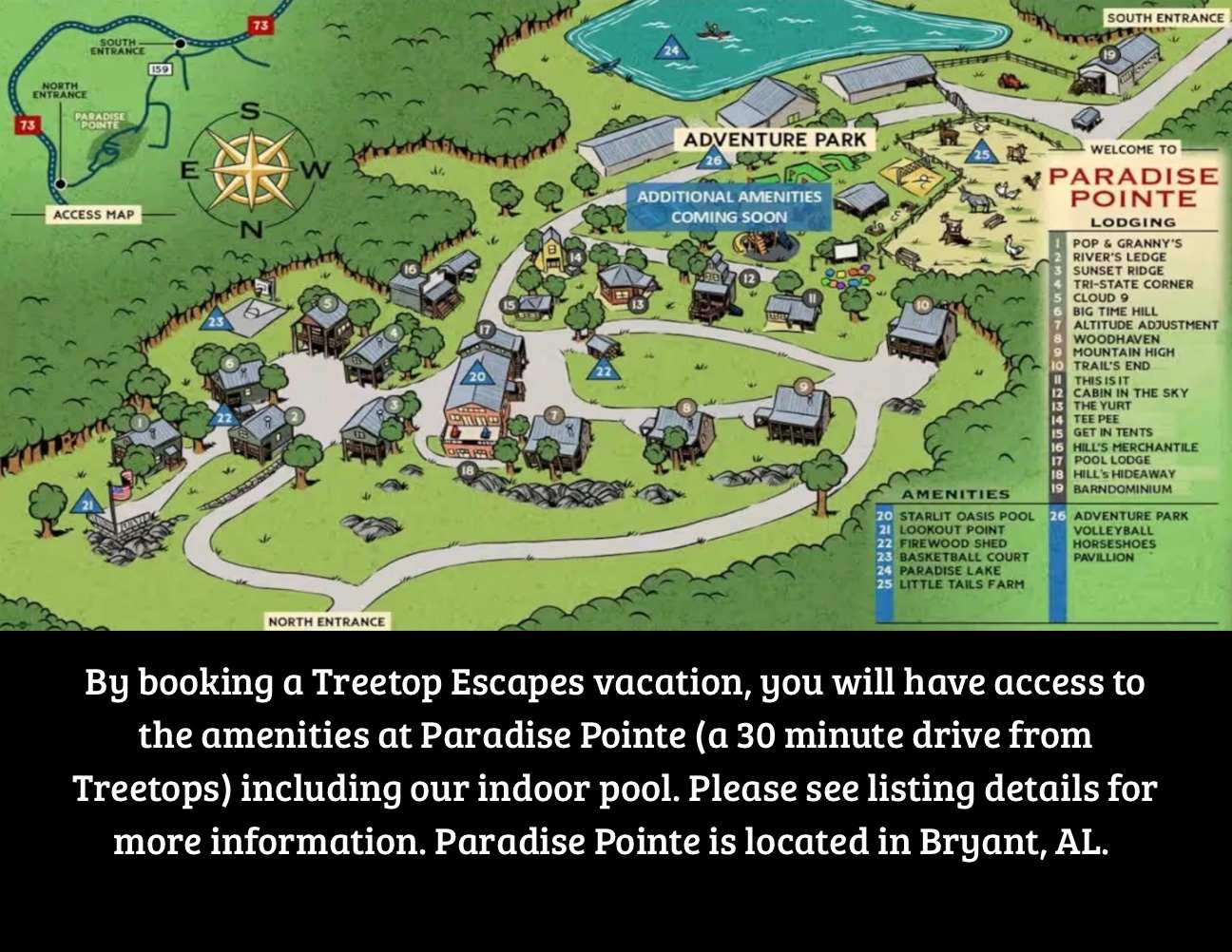 By booking a Treetop Escapes vacation, you will have access to Paradise Pointe. Paradise Pointe is a community resort at the tri-state corner of AL/TN/GA located in Bryant, AL. Hike the trail to stand in three states at once! Enjoy access to the huge indoor pool house with a communal hot tub, two indoor slides, an outdoor deck, seating, and more. 18 rentals at Paradise Pointe share these amenities. Plus, enjoy two small basketball courts, sand volleyball, horseshoes, and more for endless fun! Paradise Pointe is approximately 30 minutes from Treetop Escapes.