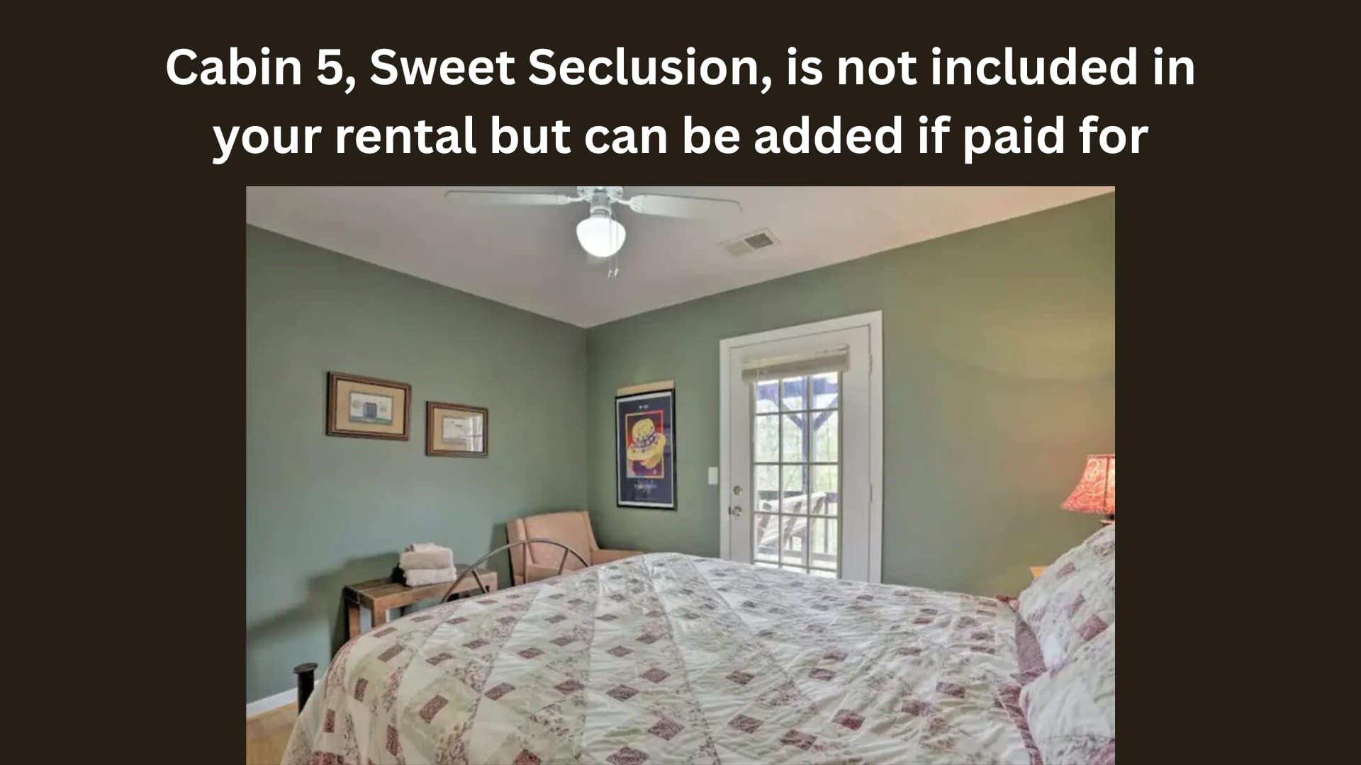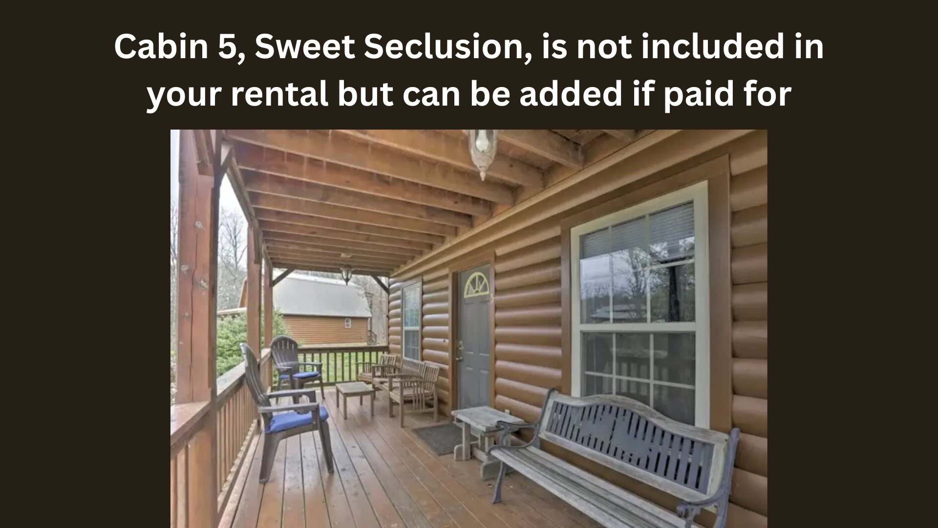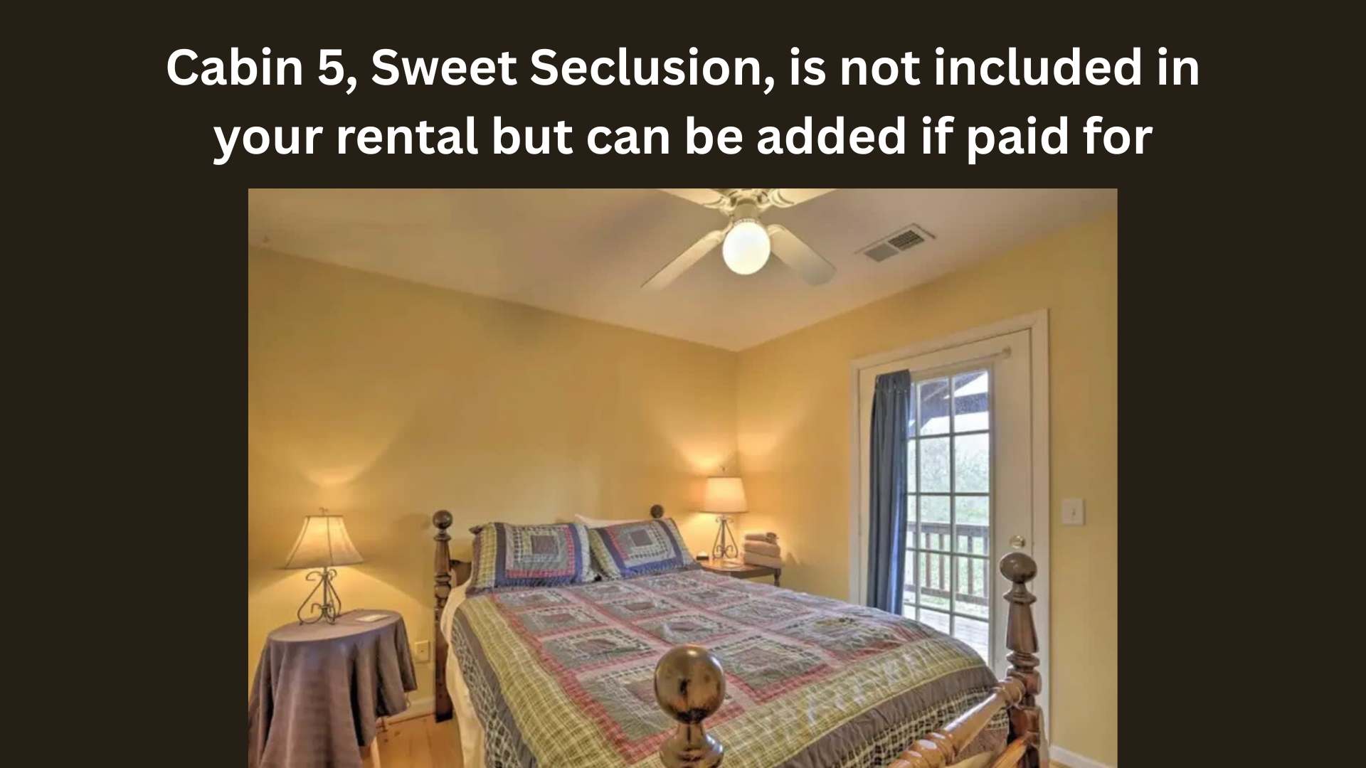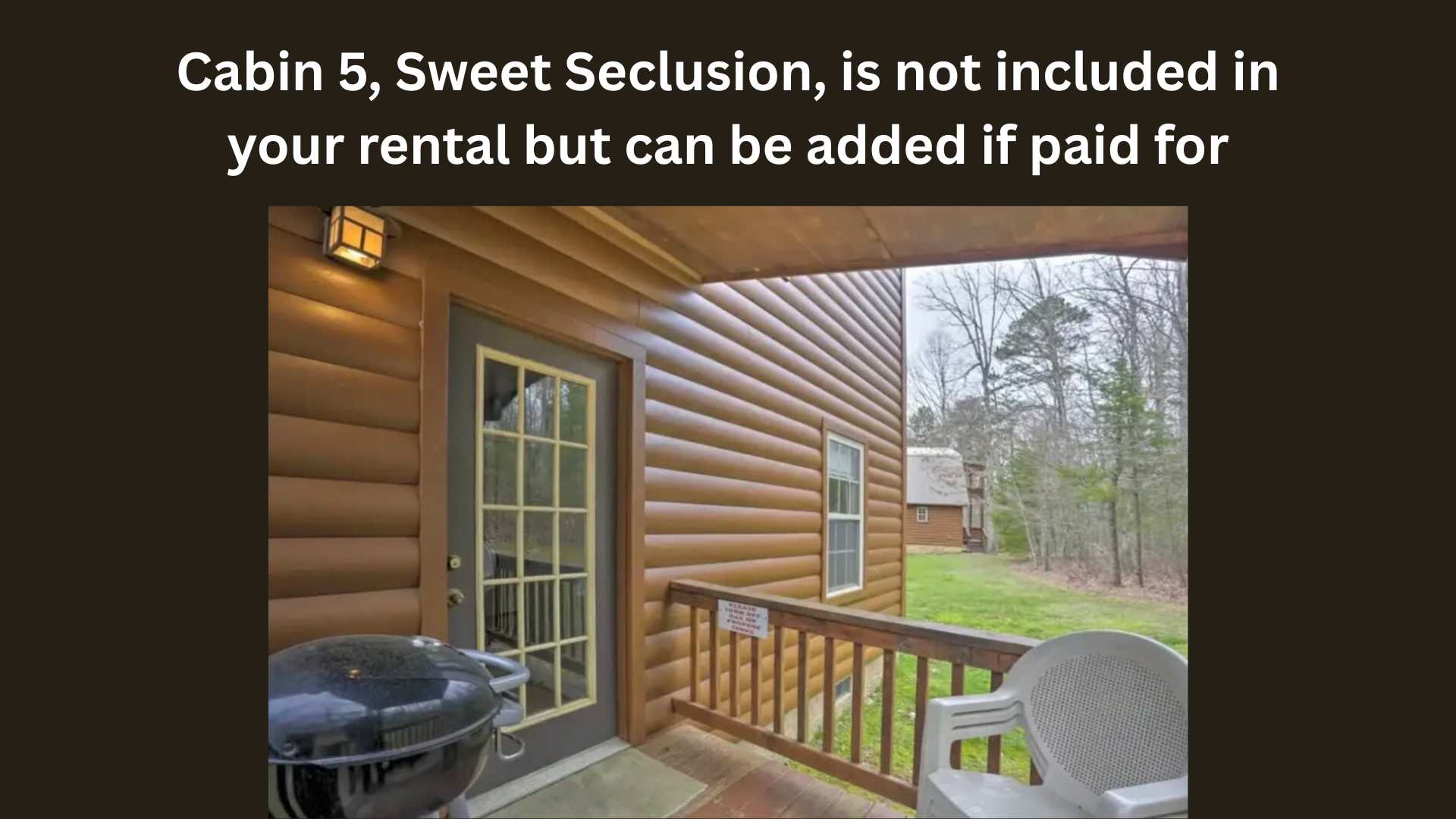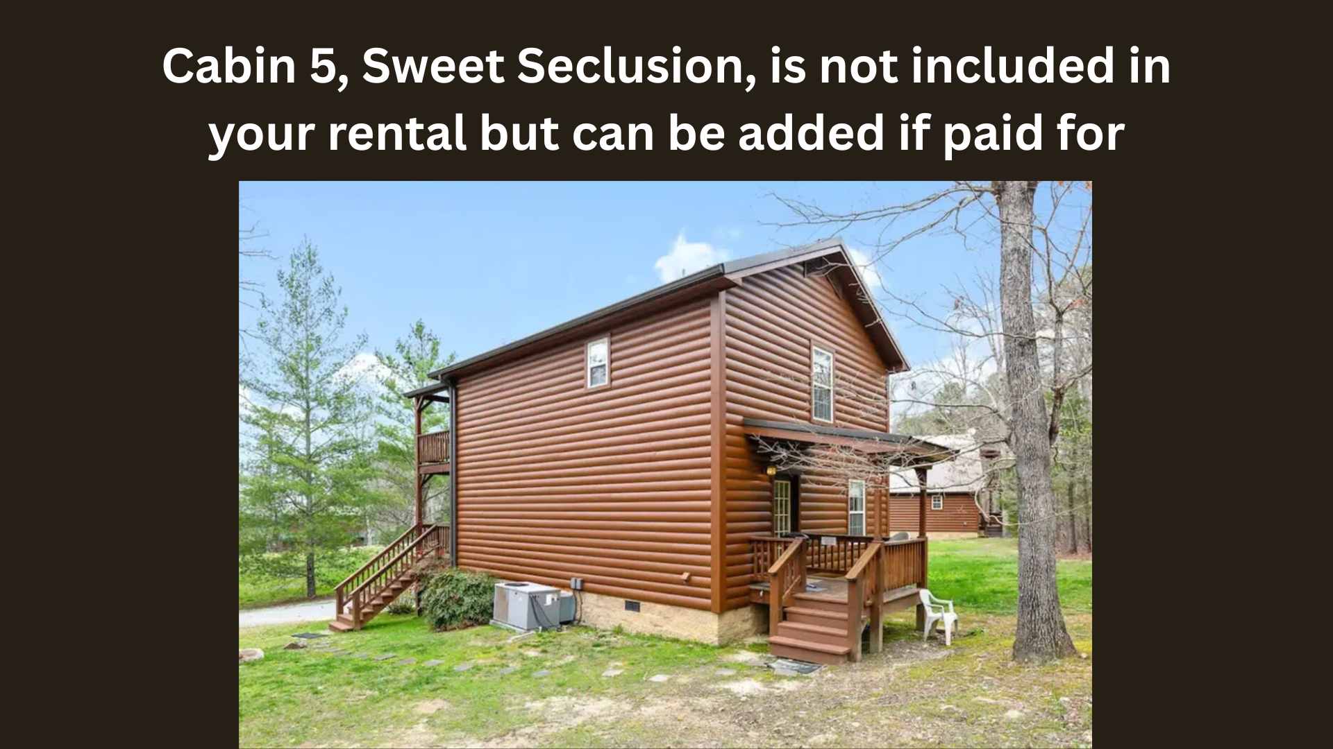 There are five total cabins on the property, when you book through this listing, you will be renting 4 of the 5 cabins. Cabins 1, 2, 3, & 4 are the cabins you are renting. If you would like to add the fifth cabin to your reservation, message us for the rates.