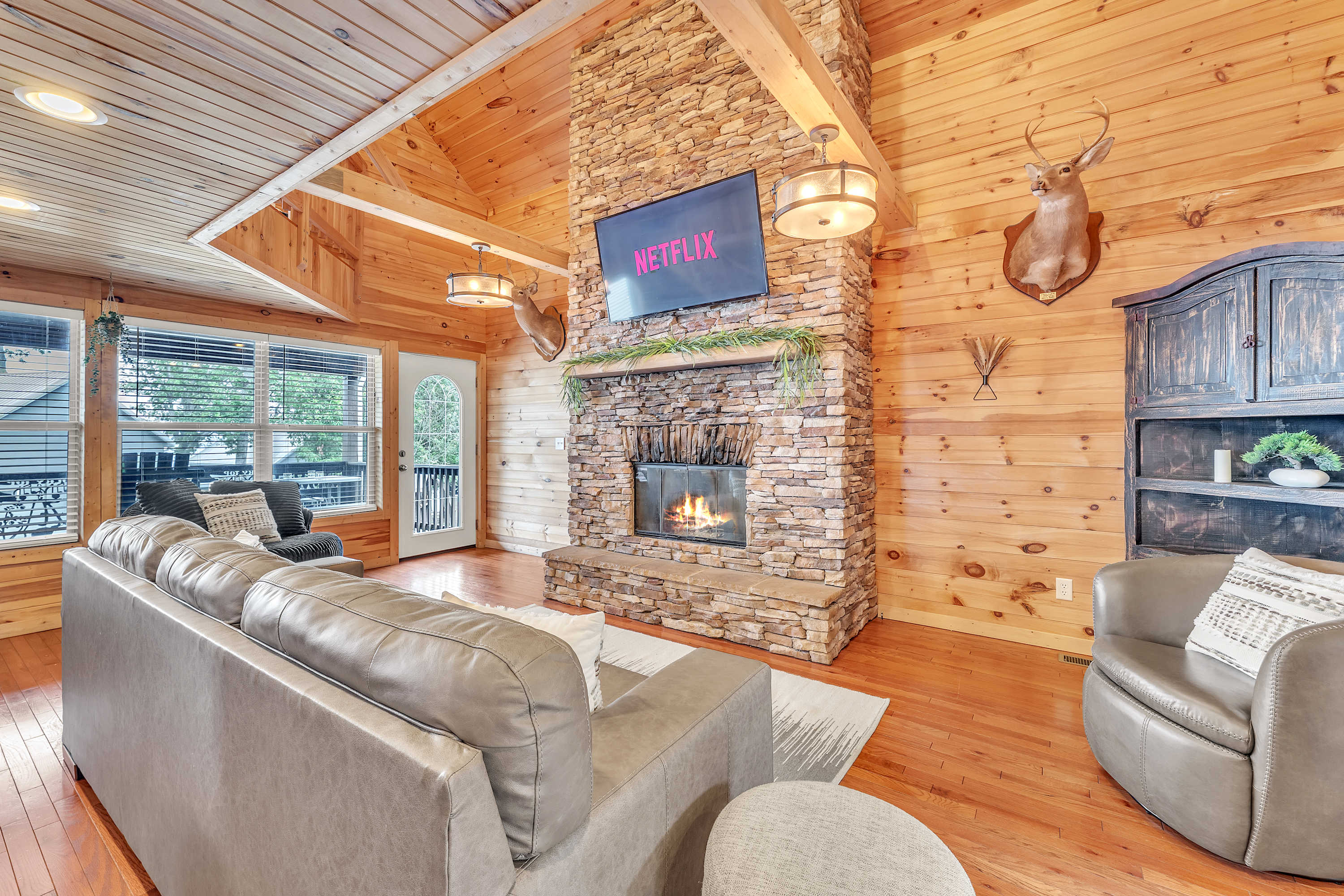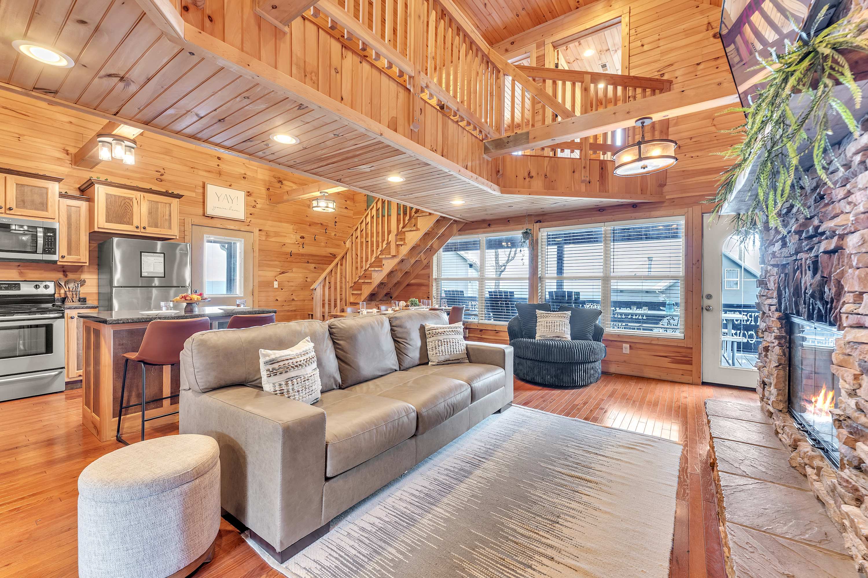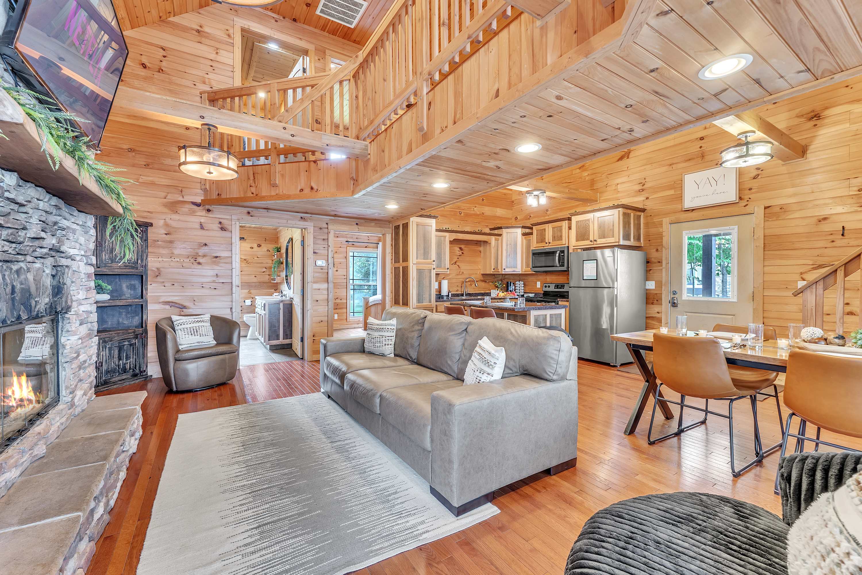 The cabin is equipped with all the amenities you need for a relaxing stay, including a cozy fireplace, a fire pit for evening gatherings, and a hot tub for unwinding after a day of exploration.