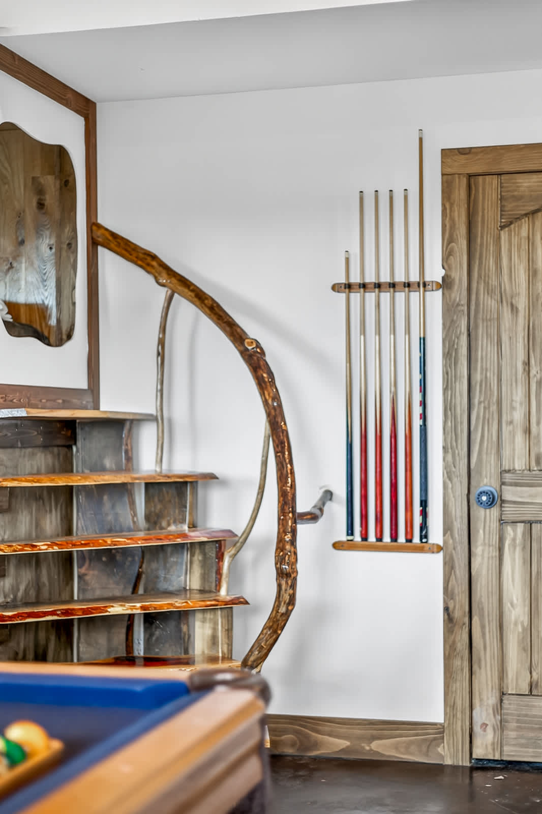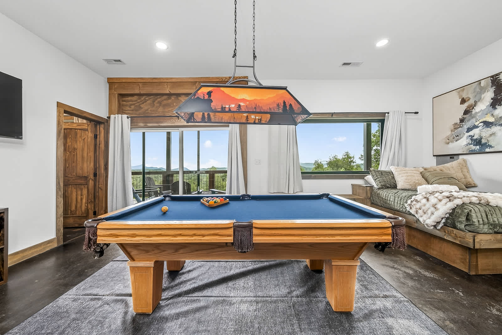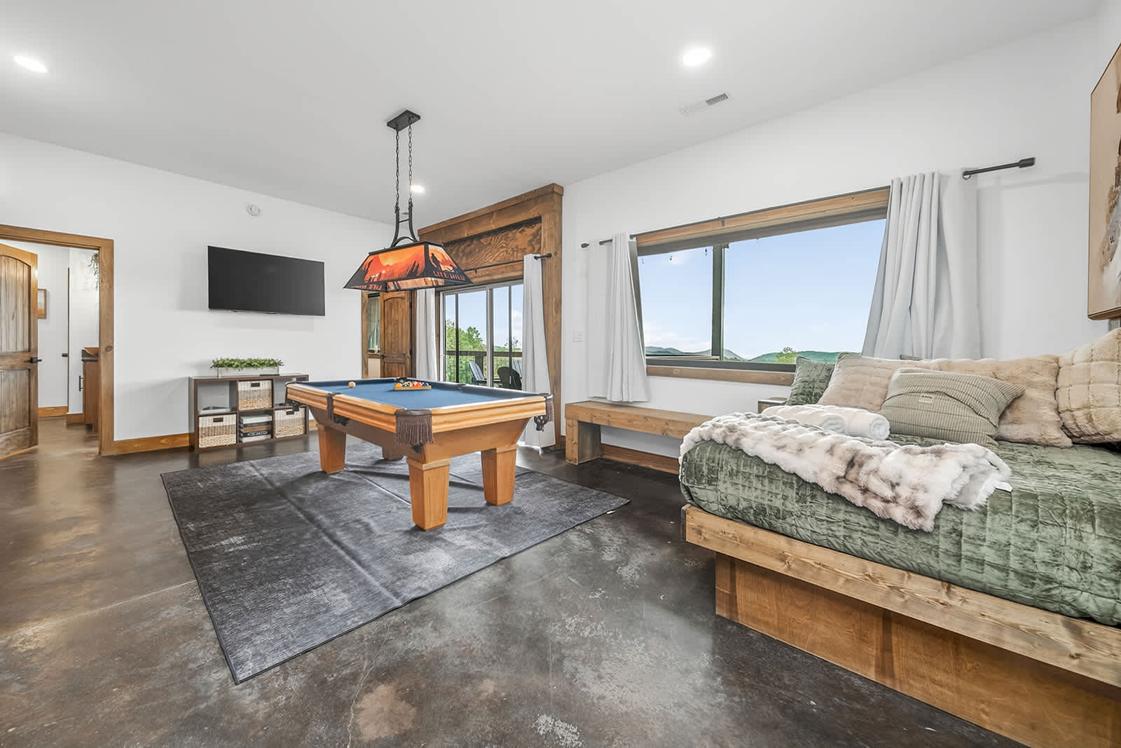 The upstairs level features an open-concept living area, fully equipped kitchen, and access to a private viewing deck—perfect for sipping coffee or unwinding after a day of adventure. The primary king bedroom on this level features a TV, cozy electric fireplace, closet, and private access to the bathroom and back deck. Downstairs, you’ll find a second king bedroom with a TV and a full bathroom. There is also an office space with two twin bunk beds. In the common area downstairs, you will also find game tables that will be added soon!